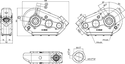 - Eingang: Hydraulikmotor mit Welle 25 mm, SAE A Flansch (z.B. CPRM)