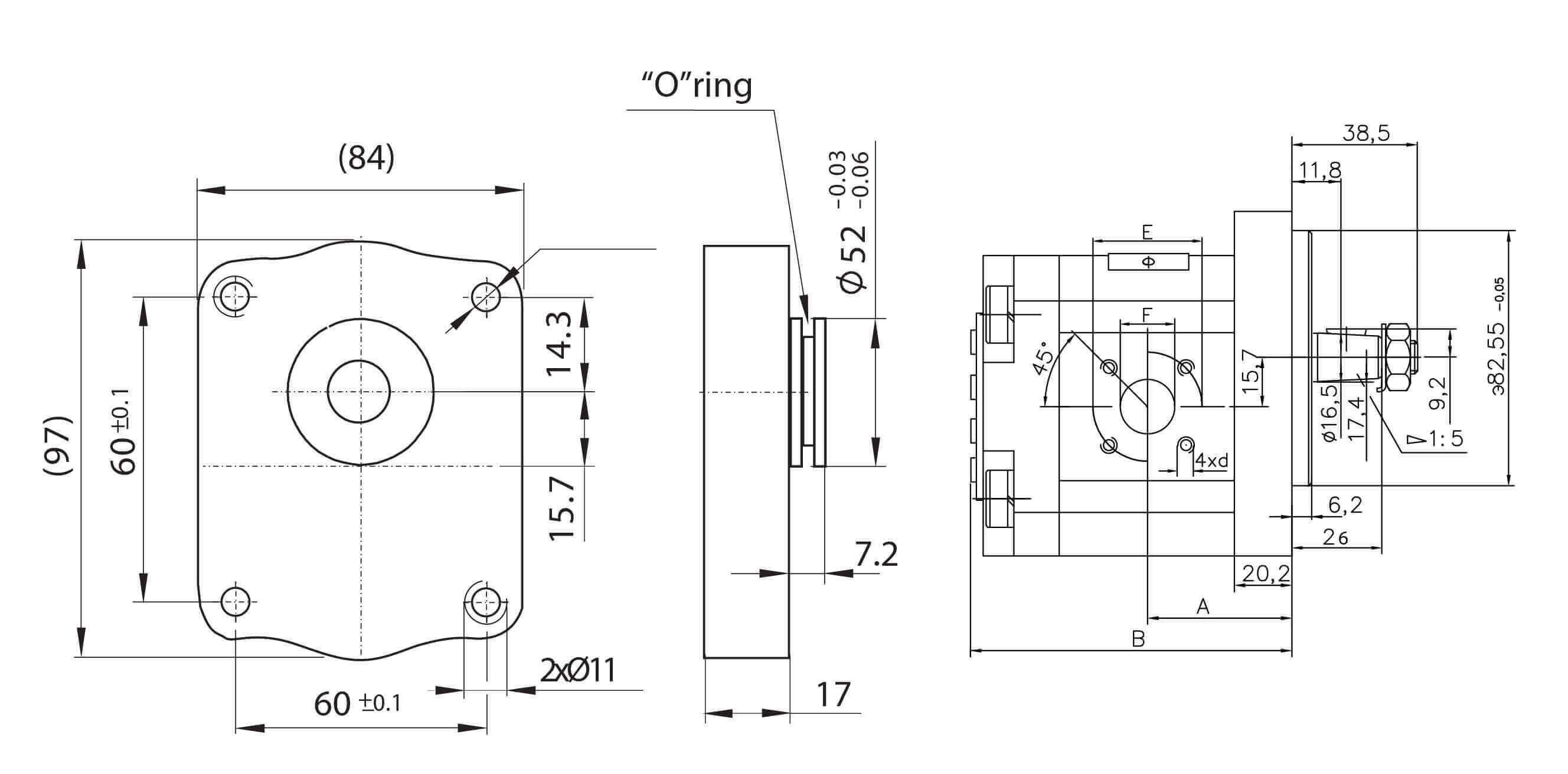 - DIN-Flansch Typ 5 (60 mm x 60 mm, 2 x Ø 11 mm)