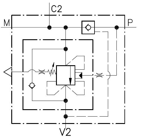 Das Ventil steuert den Öldurchfluss auf der Rücklaufseite des Zylinders über eine Differenzdruckregelung, wodurch der Eilgang ermöglicht wird.