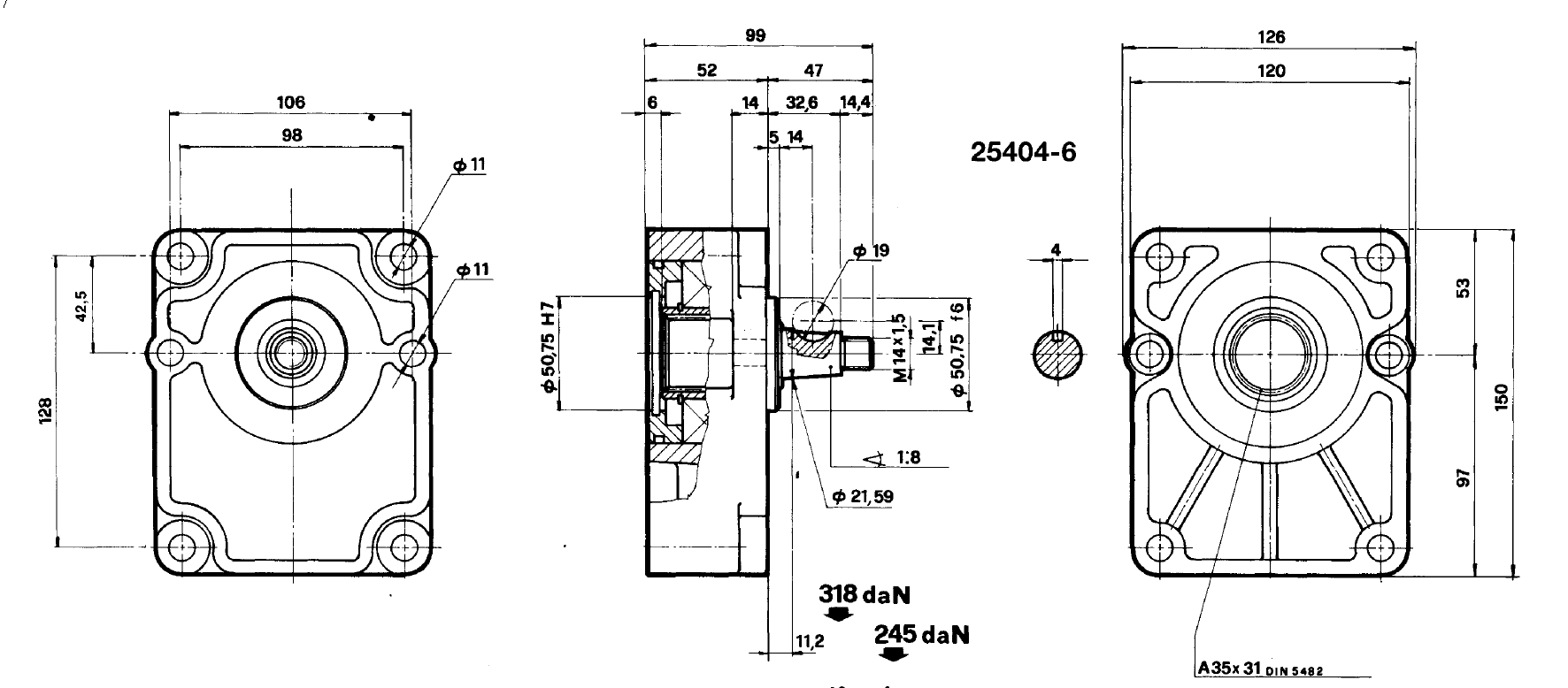 Bearing support for hydraulic pump, group 3, conical shaft 1:8