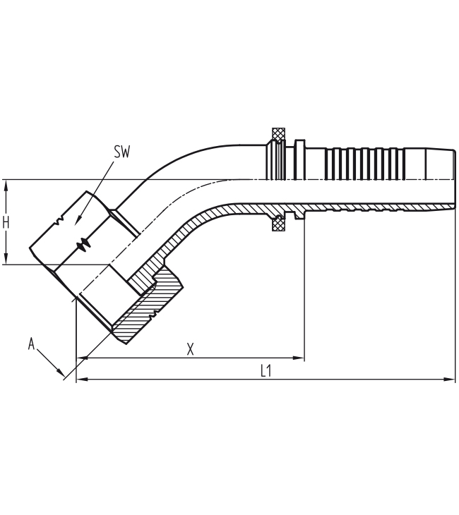 Forma di tenuta ORFS, con ghiera, curva a 45°, filettatura UN/UNF/UNS
