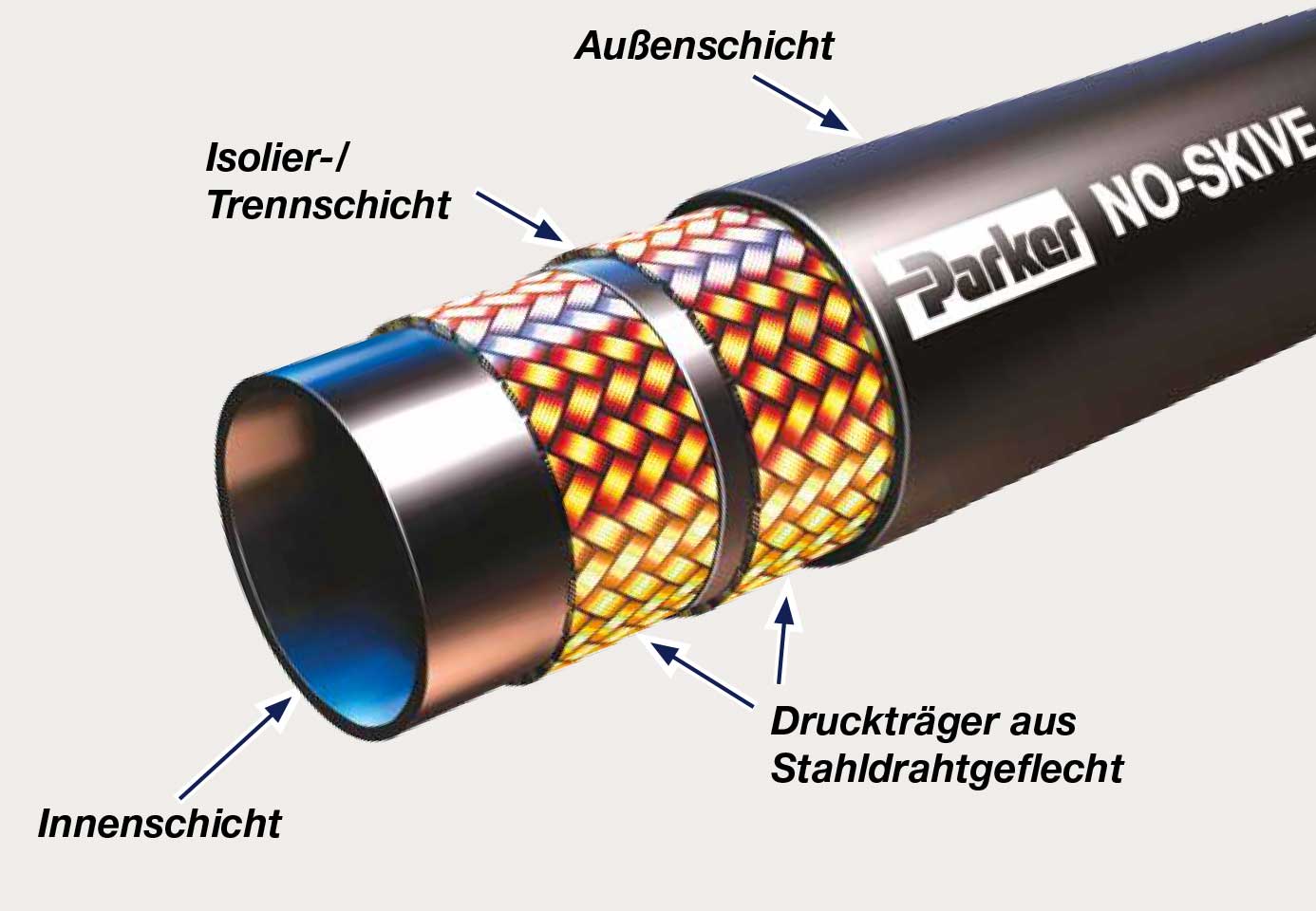 - A braided or spiralized pressure-bearing layer which surrounds the rubber inner layer: This pressure-bearing layer gives the hose the necessary mechanical strength against pressure or negative pressure of the flow medium. It also secures the hydraulic hose against kinking. The print substrate layer can consist of one or more layers of textile material, steel wire, or both.