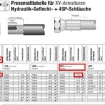 Als erstes wählt man den zu pressenden Schlauch aus und ermittelt das dazugehörige Pressmaß. Dazu verwendet man die Herstellerangaben der entsprechenden Pressarmatur.